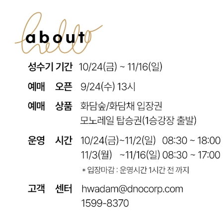 - 가을철 주말에는 오전 9시 오픈 직후 입장하면 혼잡을 피할 수 있음
