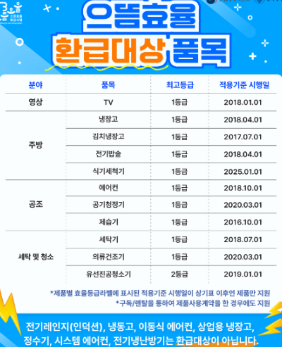 이 제도를 효과적으로 활용하려면, 제품을 선택할 때 단순히 환급 여부만 확인하지 말고 장기적인 전기요금 절감 효과까지 고려하는 것이 중요합니다. 또한 같은 품목 내에서도 효율 등급과 소비 전력이 다르므로, 제품별 에너지 소비 효율을 꼼꼼히 비교한 후 구매하는 것이 바람직합니다.